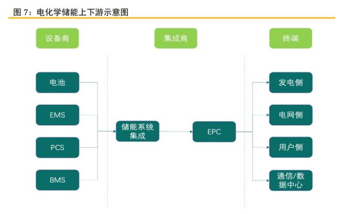 鋰離子儲能產(chǎn)業(yè)鏈由上游設(shè)備商,中游集成商和下游終端用戶組成。其中設(shè)備包括 電池、EMS(能量管理系統(tǒng))、BMS(電池管理系統(tǒng))、PCS(變流器);集成商包括儲能 系統(tǒng)集成和EPC;終端用戶則由發(fā)電側(cè)、電網(wǎng)側(cè)、用戶側(cè)以及通信/數(shù)據(jù)中心組成。