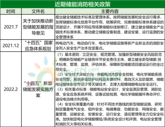 2021年12月30日國(guó)家將電化學(xué)儲(chǔ)能設(shè)施消防安全納入《“十四五”國(guó)家應(yīng)急體系規(guī)劃》,作為安全生產(chǎn)攻堅(jiān)重點(diǎn)。