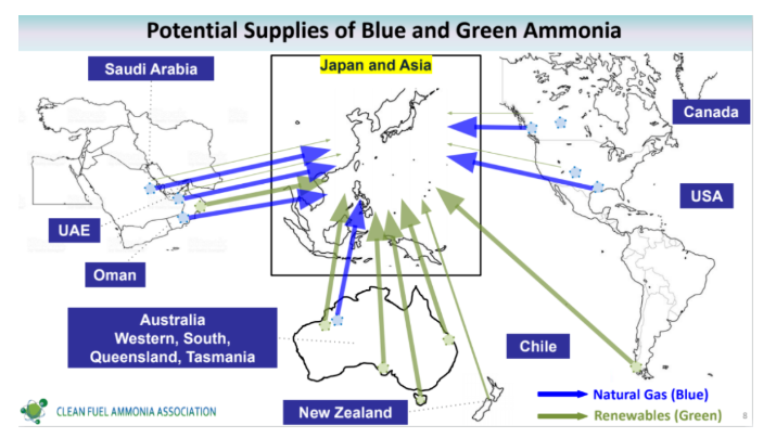 為了滿足日本國(guó)內(nèi)對(duì)氨的需求,Sam Muraki表示,日本正在與美國(guó)、澳大利亞、加拿大、新西蘭、亞洲和中東國(guó)家合作,共同建設(shè)藍(lán)氨、綠氨的供應(yīng)鏈體系。具體思路大致是,日本在這些國(guó)家當(dāng)?shù)亟ㄔ彀鄙a(chǎn)廠,在國(guó)外完成生產(chǎn)氨的低碳和脫碳過程,然后再將氨運(yùn)輸至日本國(guó)內(nèi)并建立國(guó)內(nèi)供應(yīng)鏈。