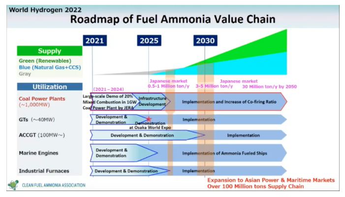 日本最大的發(fā)電商JERA率先制定了2050碳排放近零的路線圖,預(yù)計(jì)在2024年實(shí)現(xiàn)20%氨和燃煤的混合燃燒,在2050年實(shí)現(xiàn)100%的氨燃燒。為實(shí)現(xiàn)這一燃料來源的轉(zhuǎn)換,JERA計(jì)劃從2027年開始每年將購(gòu)買多達(dá)50萬(wàn)噸的氨,用作燃煤電廠的燃料,目前已向全球 30 多家公司發(fā)出提案請(qǐng)求,尋求未來采購(gòu)氨的長(zhǎng)期合作關(guān)系。