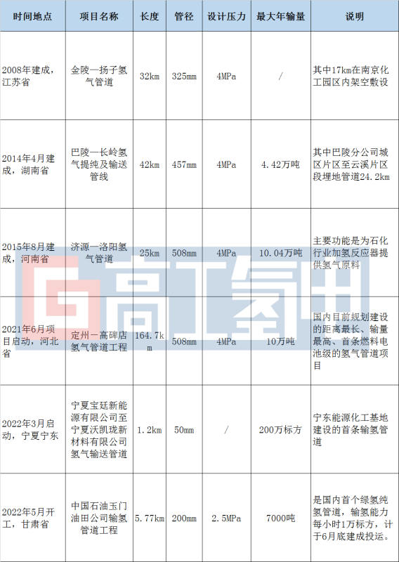 從實際建設(shè)情況來看,我國純氫管道建設(shè)處于起步階段,規(guī)模較小,總里程約400公里,已建項目以化工園區(qū)內(nèi)應(yīng)用為主,具體如下:
