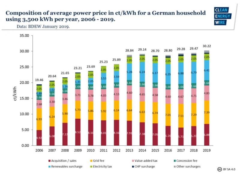 中國儲能網(wǎng)訊:根據(jù)德國能源和水業(yè)協(xié)會(BDEW)的數(shù)據(jù),2019年德國三人的普通家庭平均每年耗電3,500千瓦時,每月電費(fèi)為88.1歐元(約合人民幣690元)。這個電費(fèi)的 名義價格比1998年高出約77%,但如果按通貨膨脹調(diào)整則增幅為33%。德國家庭電費(fèi)增長的最主要原因是可再生能源附加費(fèi)的引入。