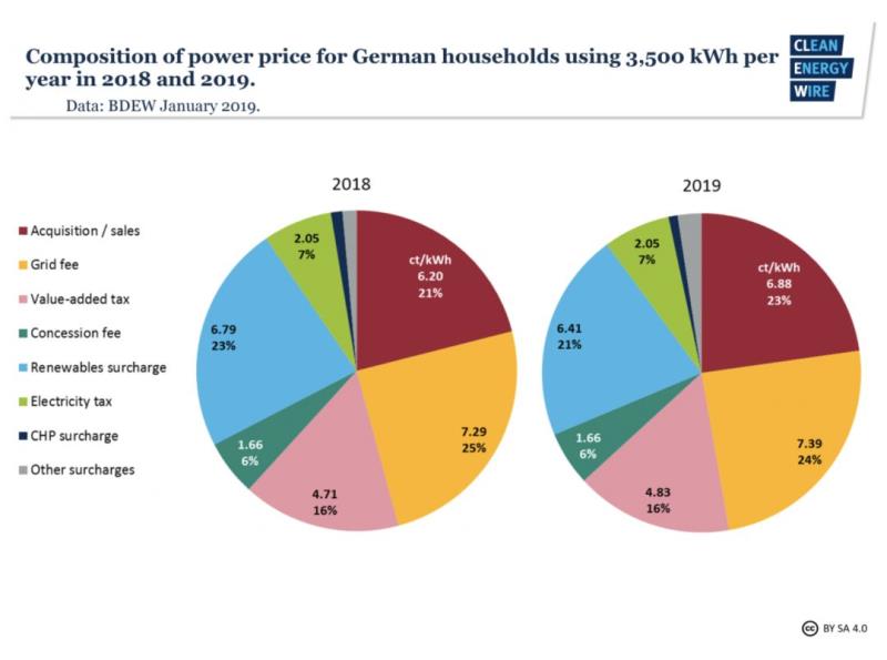 2019年德國居民電價30.22歐分/千瓦時(約合人民幣2.37元/千瓦時),其中包含可再生能源附加費(fèi)(6.41歐分/千瓦時,約合人民幣0.5元/千瓦時),占到居民電價的21%。