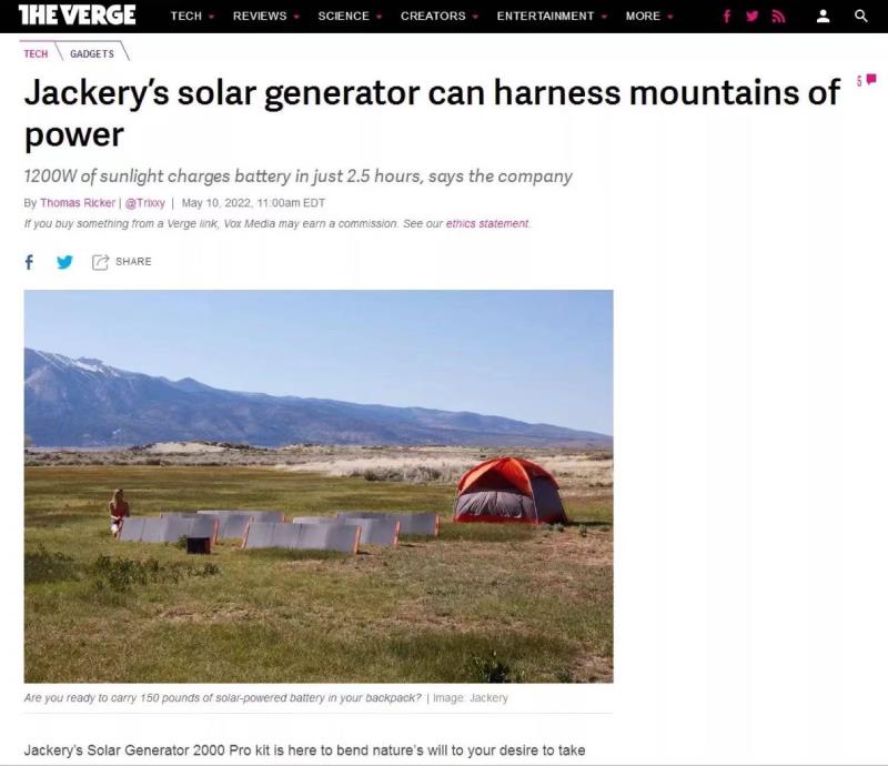 作為全球暢銷的光充戶外電源品牌,電小二Jackery的一舉一動都引起市場關注。此次光充戶外電源2000 Pro也引起了全球媒體的注意,BBC最新夏日旅行專題文章就建議大家van life時可帶上便攜冰箱、野營爐灶、筆記本電腦等設備提升戶外生活品質(zhì),多接口易操作的Jackery光充戶外電源可在戶外為它們提供電力支持??萍济襟wThe Verge則盛贊Jackery solar Generator可制造澎湃電力。