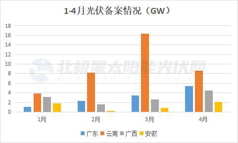 據北極星太陽能光伏網統(tǒng)計,1-4月廣西、廣東、云南、安徽四地光伏備案規(guī)模超64GW,云南以37.1GW領先,廣西、廣東備案均超10GW,安徽備案超過了5GW。