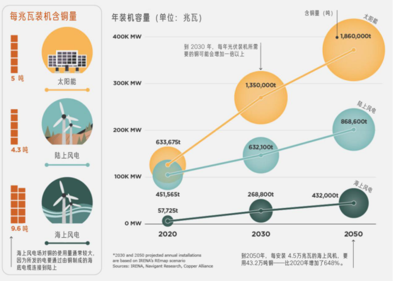 銅有著極佳的導熱性和導電性,因此是能源技術中使用最廣泛的礦物,對所有與電力相關的基礎設施都至關重要。根據(jù) Navigant Research 的數(shù)據(jù),以下是風能和太陽能發(fā)電場每兆瓦裝機使用的銅量: