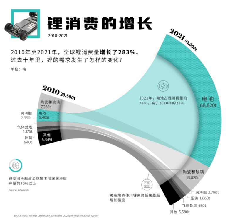 由于鋰在清潔能源技術中的應用,自2010年以來,鋰的消費量幾乎增長了4倍。不但需求增加了,用途也發(fā)生了變化。以往鋰最大的用途是陶瓷和玻璃制造業(yè)。在陶瓷和玻璃器皿的涂層中添加碳酸鋰可以減少熱膨脹,這對于現(xiàn)代玻璃陶瓷灶具來說是必不可少的。但在這十年間,電動汽車發(fā)展迅速,占全球汽車市場份額從2010年的0.01%飆升至2021年的8.6%。這對電池產(chǎn)生了巨大的需求,目前電池用鋰占全球鋰消費量的近四分之三。隨著電動汽車的普及,本世紀20年代或許是標志著鋰消費增長的又一個十年。多個國家已經(jīng)承諾到2030年逐步淘汰內(nèi)燃機汽車,大眾、通用和福特等大型汽車制造商都在計劃推出新的電動汽車。鋰的消耗量預計會持續(xù)增加,到2025年,電池消耗的鋰將占鋰總產(chǎn)量的84%。