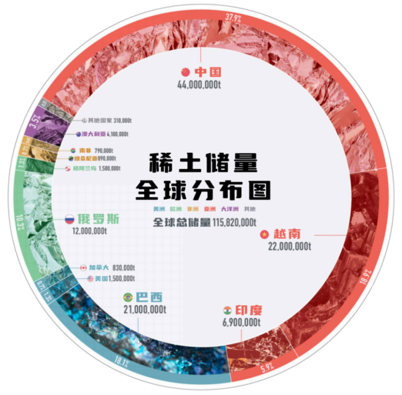 目前全球稀土元素儲量約為1.15億噸,中國在稀土礦產(chǎn)量和儲量位居世界第一,儲量為4400萬噸,比位居第二和第三位的越南(2200萬噸)和巴西(2100萬噸)儲量之和還要多。中國的稀土礦山主要集中在內(nèi)蒙古、山東、四川和南方的部分省份。其中內(nèi)蒙古白云鄂博稀土礦被稱為世界第一大稀土礦。
