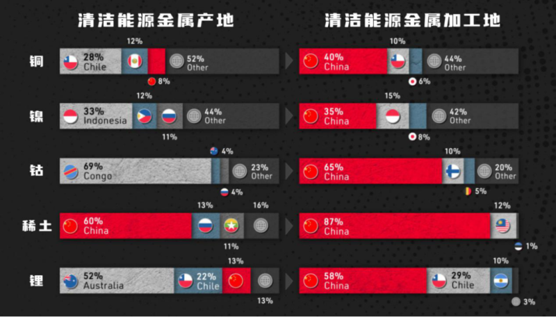 中國產(chǎn)出了全球60%的稀土元素,這些元素被用于制造電子設備,包括智能手機和電腦。鋰的生產(chǎn)市場份額由澳大利亞(52%)和智利(22%)主導,中國占有約13%。清潔能源金屬加工業(yè)務方面,中國占比較高,鎳、鋰、鈷和稀土元素加工比重分別為35%、58%、65%和87%。