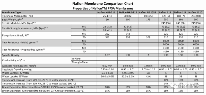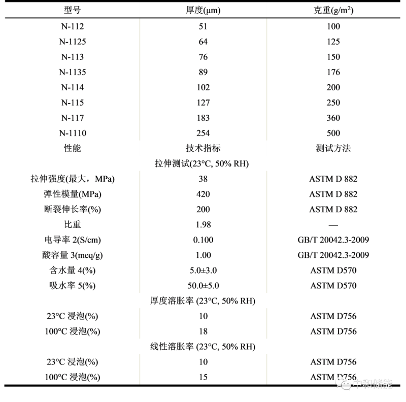 以美國杜邦公司生產(chǎn)的全氟磺酸質(zhì)子交換膜Nafion?系列膜(Nafion? 112、Nafion? 115、Nafion? 117等)為例,在中國售賣的產(chǎn)品N115和N117,其少量零售價分別為13500元/平方米和15000-19000元/平方米,批量售價也在2000-3000元/平方米。據(jù)其公開資料顯示,Nafion全氟磺酸 (PFSA) 膜是PFSA/聚四氟乙烯 (PTFE) 共聚物膜,其用于儲能方面的膜主要包括采用流延法生產(chǎn)的具有高穩(wěn)定性的NR211和NR212,其厚度分別為25.4微米和50.8微米,以及擠出法生產(chǎn)的高穩(wěn)定性的N115和N117,其厚度分別為125微米和183微米,其主要性能如下所示。在表中顯示的相關(guān)產(chǎn)品性能,NR211、NR212、N115、N117的機(jī)械方向(MD)拉伸強(qiáng)度分別為23MPa,32MPa,43MPa和43MPa,隨著厚度提升其拉伸強(qiáng)度隨之提升。相關(guān)文獻(xiàn)報(bào)道目前其主要電導(dǎo)率參數(shù)N117為0.035 S cm?1,其它Nafion的性能也在0.05-0.07 S cm?1左右,隨厚度減小而逐漸電導(dǎo)率增加。