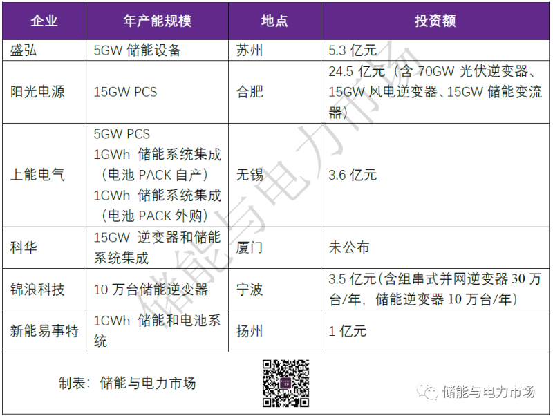 根據(jù)儲(chǔ)能與電力市場對主要逆變器企業(yè)擴(kuò)產(chǎn)投資動(dòng)態(tài)的追蹤,目前陽光電源、上能、科華、盛弘、錦浪等企業(yè)的儲(chǔ)能業(yè)務(wù)擴(kuò)產(chǎn)規(guī)模已經(jīng)超過40GW,涉及儲(chǔ)能PCS、儲(chǔ)能和電池系統(tǒng)集成、戶用儲(chǔ)能產(chǎn)品等多個(gè)領(lǐng)域。