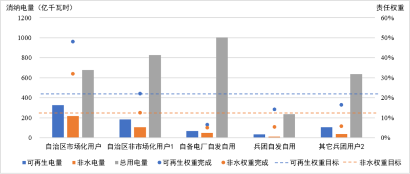 1.公網(wǎng)非市場(chǎng)化用戶。根據(jù)消納保障機(jī)制,對(duì)于電網(wǎng)企業(yè)按照可再生能源發(fā)電保障性收購(gòu)要求統(tǒng)一收購(gòu)可再生能源電量對(duì)應(yīng)的消納量,首先用于完成居民、農(nóng)業(yè)、重要公用事業(yè)和公益性服務(wù)、非市場(chǎng)化用電量對(duì)應(yīng)消納責(zé)任權(quán)重任務(wù)。如有剩余,電網(wǎng)企業(yè)按照各省級(jí)政府出臺(tái)的可再生能源電力消納保障實(shí)施方案,向各市場(chǎng)主體分配剩余的保障性收購(gòu)電量。雖然新疆未公布非市場(chǎng)化用戶消納完成情況,但根據(jù)上述規(guī)定推斷,非市場(chǎng)化用戶優(yōu)先完成了22%和12.5%責(zé)任權(quán)重目標(biāo)。