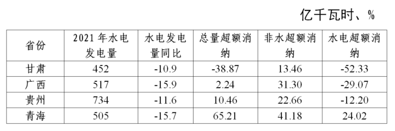 值得注意的是,2021年全國(guó)水電發(fā)電量是近十年來(lái)第一次出現(xiàn)負(fù)增長(zhǎng),全國(guó)包括甘肅在內(nèi)共有14個(gè)省份負(fù)增長(zhǎng)。根據(jù)中電聯(lián)《2021-2022年度全國(guó)電力供需形勢(shì)分析預(yù)測(cè)報(bào)告》,2021年受汛期主要流域降水偏少等因素影響,全國(guó)規(guī)模以上工業(yè)企業(yè)水電發(fā)電量同比下降2.5%。將與甘肅2021年水電發(fā)電量總量及增速相近的三個(gè)省份做對(duì)比可以發(fā)現(xiàn)(表1),廣西、貴州的水電超額消納量均為負(fù),主要通過(guò)超額完成非水電可再生能源消納電量來(lái)實(shí)現(xiàn)總量責(zé)任權(quán)重目標(biāo)。青海非水和水電均超額完成,通過(guò)測(cè)算,非水的超額完成為水電目標(biāo)創(chuàng)造了65億千瓦時(shí)的彈性空間,也就是說(shuō),即便青海水電超額消納量為0、甚至為-41億千瓦時(shí),依然可以超額或剛好完成總量責(zé)任權(quán)重目標(biāo)。