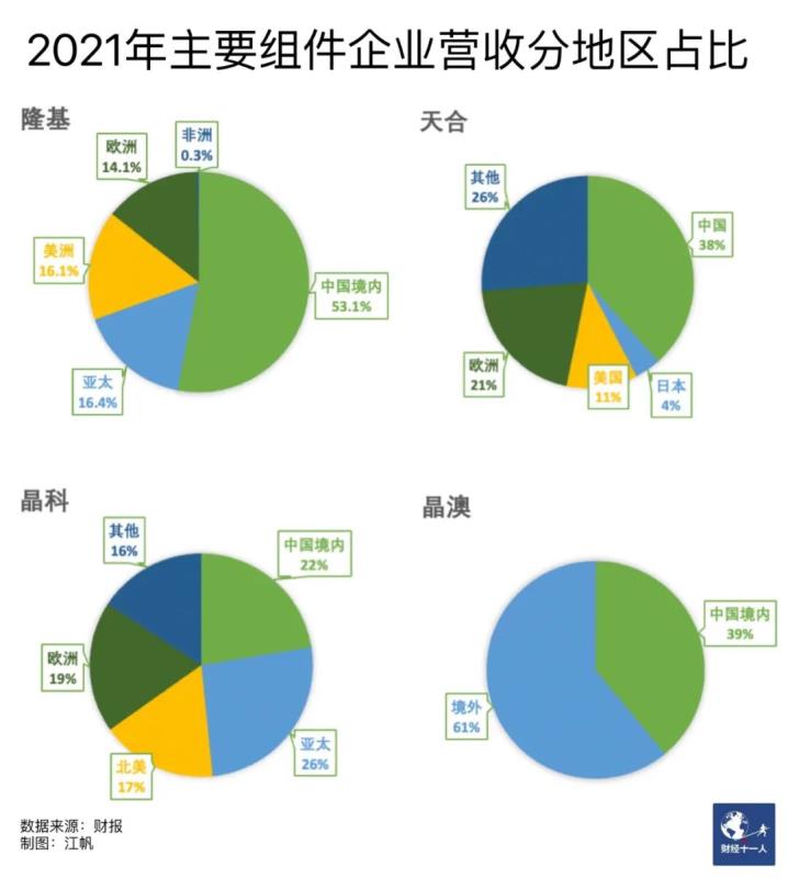面對(duì)多地開(kāi)花的海外市場(chǎng),組件巨頭的全球化布局至關(guān)重要。得益于較早開(kāi)展業(yè)務(wù),三巨頭建立起了較為完善的全球化銷售網(wǎng)絡(luò),為開(kāi)拓渠道奠定基礎(chǔ)、加深壁壘,有效減輕對(duì)個(gè)別市場(chǎng)過(guò)度依賴。2021年,三巨頭海外收入占比均在60%以上,明顯高于以國(guó)內(nèi)市場(chǎng)為重心的隆基。