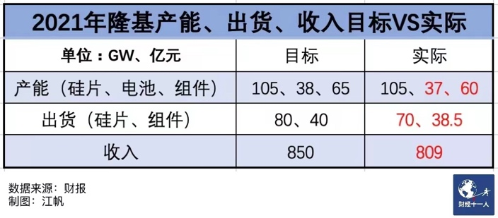 2021年,隆基硅片、組件產(chǎn)能利用率創(chuàng)歷史新低,分別為72%、69%,同比下降23個(gè)、21個(gè)百分點(diǎn)。受此影響,其四季度凈利潤(rùn)罕見(jiàn)下滑30%,且全年產(chǎn)能、業(yè)務(wù)、收入目標(biāo)均未完成。