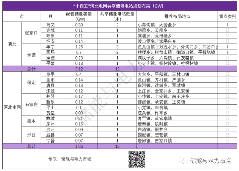 在全面調(diào)研河北實(shí)際情況后,《方案》將河北省各縣區(qū)分成了一類、二類兩類區(qū)域,一類區(qū)域可配置2-3個(gè)儲(chǔ)能電站,二類區(qū)域可配置1個(gè)儲(chǔ)能電站。