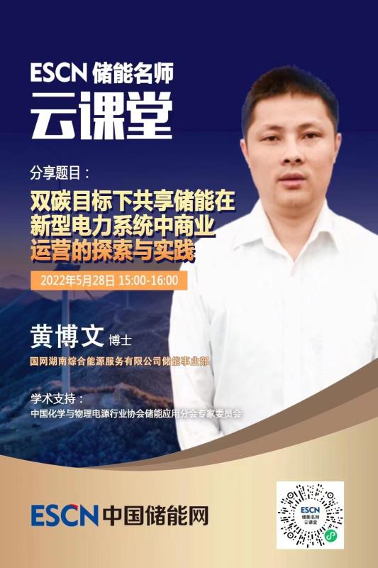 5月28日下午15:00-16:00,中國儲能網(wǎng)邀請國網(wǎng)湖南綜合能源服務(wù)有限公司儲能事業(yè)部黃博文博士做客“ESCN儲能名師云課堂”(在線直播),為大家分享《雙碳目標(biāo)下共享儲能在新型電力系統(tǒng)中商業(yè)運(yùn)營的探索與實(shí)踐》主題報告。歡迎業(yè)界同仁在線學(xué)習(xí)與交流。