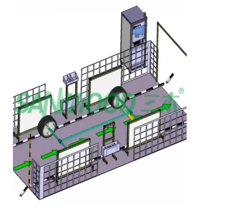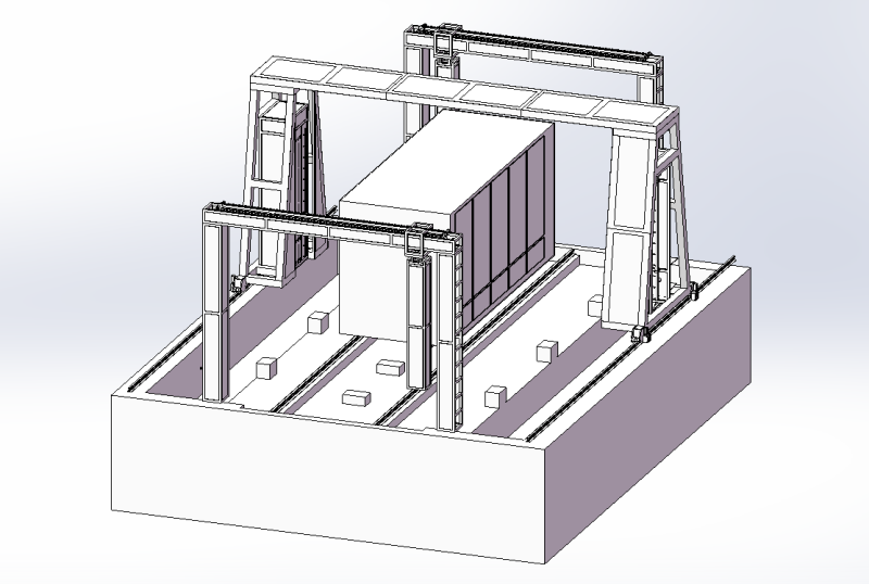 集裝箱頂部與左右兩側(cè)采用行車(chē)固定自動(dòng)噴淋系統(tǒng),前后側(cè)采用龍門(mén)支架,噴頭可左右移動(dòng)。