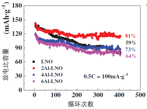 與未摻雜材料相比,適宜濃度的鋁摻雜材料在0.5C電流密度測試時,循環(huán)400次的容量保持率從59%提升到81%。