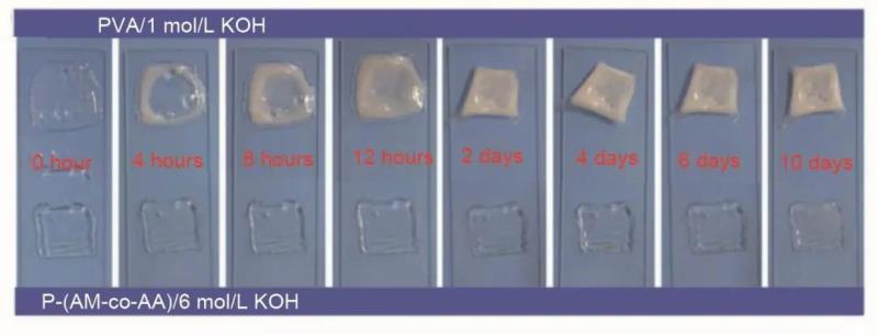 更多的研究集中在使用聚合物制備固態(tài)水凝膠電解質(zhì),包括聚乙烯醇(PVA)、丙烯酸(AA)、聚乙烯吡咯烷酮(PVP)等。Zhang等人制作了全固態(tài)鋁空氣電池,凝膠電解質(zhì)采用了在AA單體中添加交聯(lián)劑N, N-亞甲基雙丙烯酰胺(MBA)和引發(fā)劑過硫酸鉀,再加入36%(質(zhì)量分數(shù),下同)的KOH溶液制成,離子電導率可達到460 m S/cm。Cao等人使用丙烯酰胺(acrylamide,AM)和丙烯酸(acrylic acid,AA)單體,加入交聯(lián)劑MBA,發(fā)生聚合。將制成的聚合物薄膜浸泡在6 mol/L KOH中,最終制備成P-(AM-co-AA)/KOH凝膠電解質(zhì)薄膜。PVA凝膠在空氣中失水會變白色并且變脆,而P-(AM-co-AA)/KOH凝膠電解質(zhì)薄膜保水性良好,如圖5所示。Miao等人使用聚丙烯酰胺(PAM)為凝膠電解質(zhì)的合成材料制備固態(tài)電解質(zhì),PAM固態(tài)電解質(zhì)較傳統(tǒng)的PVA和PAA凝膠電解質(zhì)表現(xiàn)出更好的離子電導率,也同樣具備良好的力學性能。3 g AM和20% KOH制備的凝膠電解質(zhì)離子電導率能達到0.2156 S/cm。PEO/PVA凝膠膜離子電導率隨著溫度升高而增大,通過改變溫度可以控制凝膠電解質(zhì)離子電導率;也可通過降低聚合物的結(jié)晶度提高其離子電導率,Deghiedy等人通過向PVA/PVP共混物增加PVP濃度來降低聚合物的結(jié)晶性,增強其滲透性和黏附性能。聚合物共混物表現(xiàn)出比單個成分更好的力學性能。通過多種聚合物的協(xié)同作用減小聚合物結(jié)晶度,通過加入玻璃纖維增強其力學性能和框架結(jié)構(gòu)是目前提高凝膠電解質(zhì)離子電導率的有效途徑。表2總結(jié)了一些使用聚合物制備凝膠電解質(zhì)的研究結(jié)果。可以看出,大多研究仍在關注堿性凝膠電解質(zhì),酸性凝膠電解質(zhì)提及較少,仍然是較空白的領域。Mano等人的研究證明了聚氮-異丙基丙烯酰胺(PNIPAM)與PAA在低pH的作用下形成很強的氫鍵,使它們混合后鏈的移動性降低并起到交聯(lián)的作用。Migliardini等人和Tonia等人以黃原膠為原料,在酸性條件下制備的凝膠電解質(zhì)具備良好的離子傳導性,組裝成固態(tài)鋁空氣電池具有較高的容量與負極效率,因為黃原膠可以作為自腐蝕的緩蝕劑,抑制鋁枝晶的形成,但該電池不能充電,因為較強的析氫反應消耗了電流,而高的電解質(zhì)反應活性與高氫氣濃度有關。堿性凝膠電解質(zhì)具有更大的電化學窗口和放電電壓,但負極效率較低。