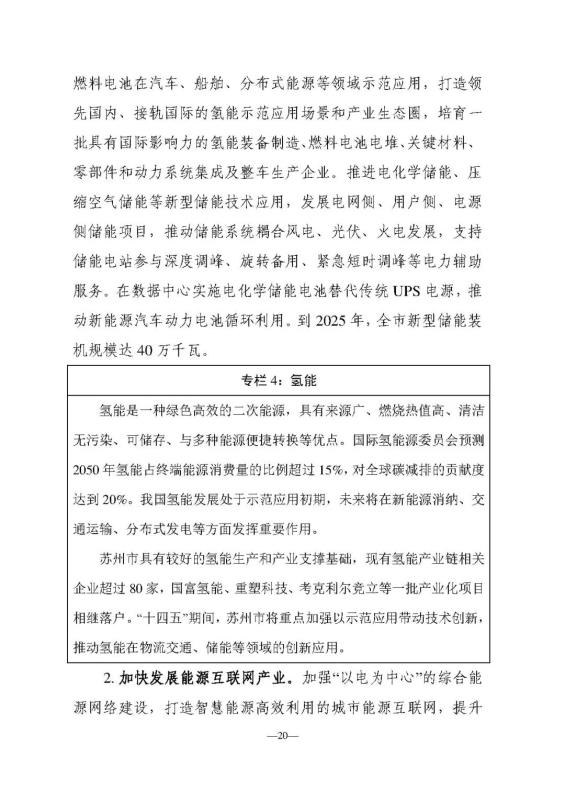 充分發(fā)揮蘇州市裝備制造業(yè)發(fā)達(dá)和應(yīng)用場(chǎng)景豐富的優(yōu)勢(shì),推動(dòng)氫能、新型儲(chǔ)能等技術(shù)應(yīng)用和產(chǎn)業(yè)發(fā)展。推進(jìn)電化學(xué)儲(chǔ)能、壓縮空氣儲(chǔ)能等新型儲(chǔ)能技術(shù)應(yīng)用,發(fā)展電網(wǎng)側(cè)、用戶側(cè)、電源側(cè)儲(chǔ)能項(xiàng)目,推動(dòng)儲(chǔ)能系統(tǒng)耦合風(fēng)電、光伏、火電發(fā)展,支持儲(chǔ)能電站參與深度調(diào)峰、旋轉(zhuǎn)備用、緊急短時(shí)調(diào)峰等電力輔助服務(wù)。在數(shù)據(jù)中心實(shí)施電化學(xué)儲(chǔ)能電池替代傳統(tǒng)UPS電源,推動(dòng)新能源汽車動(dòng)力電池循環(huán)利用。到2025年,全市新型儲(chǔ)能裝機(jī)規(guī)模達(dá) 40萬(wàn)千瓦。