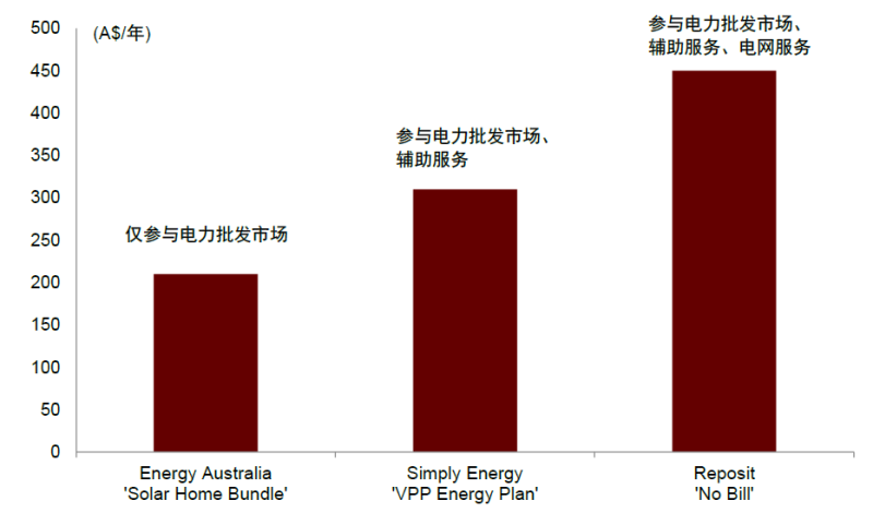 虛擬電廠提供額外收益來(lái)源。澳大利亞各州提供眾多虛擬電廠項(xiàng)目,截至2022年4月,澳洲累計(jì)虛擬電廠項(xiàng)目達(dá)61個(gè),其主要技術(shù)為表后儲(chǔ)能,而表后儲(chǔ)能又以家庭儲(chǔ)能為主。澳洲VPP項(xiàng)目通常可通過(guò)三種方式獲取收益:1)VPP通過(guò)電力零售商進(jìn)入電力批發(fā)市場(chǎng);2)提供緊急的需求側(cè)相應(yīng)等電網(wǎng)服務(wù);3)提供輔助服務(wù)。澳洲居民可在安裝家庭光儲(chǔ)系統(tǒng)時(shí)即與系統(tǒng)零售商簽訂VPP項(xiàng)目協(xié)議以換取一定購(gòu)置折扣,或可與獨(dú)立的VPP聚合商簽訂VPP協(xié)議,將儲(chǔ)能系統(tǒng)部分容量參與VPP項(xiàng)目獲取額外收益。如新南威爾士州居民加入不同VPP項(xiàng)目可獲得約200-450澳元/年的額外利益。