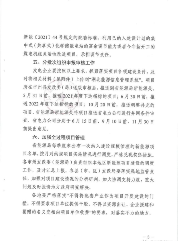 時(shí)間安排上,發(fā)電企業(yè)抓緊落實(shí)項(xiàng)目各項(xiàng)建設(shè)條件,及時(shí)將相關(guān)材料(見(jiàn)附件)上傳到“湖北能源信息管理系統(tǒng)”。項(xiàng)目所在市州縣發(fā)改委(局)逐級(jí)審核后,推送到省能源局新能源處。5月31日前,推送2021年度下達(dá)指標(biāo)的項(xiàng)目;6月30日前推送2022年度下達(dá)指標(biāo)的項(xiàng)目;10月20日前,推送調(diào)整補(bǔ)充的項(xiàng)目。