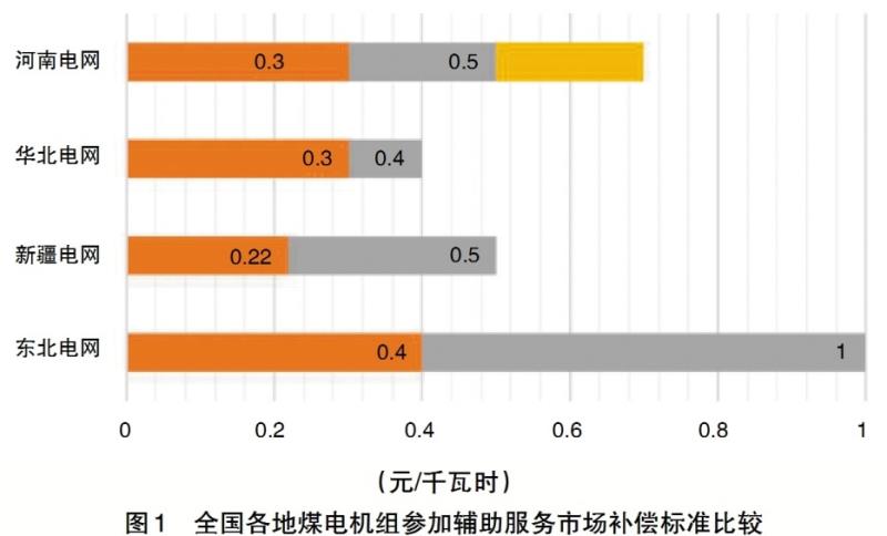一是調(diào)峰輔助服務(wù)市場(chǎng)機(jī)制不健全,煤電企業(yè)缺乏足夠的補(bǔ)償激勵(lì)。經(jīng)濟(jì)性是導(dǎo)致煤電靈活性改造進(jìn)度遲緩的首要因素。東北電網(wǎng)2014年率先試行輔助服務(wù)補(bǔ)償機(jī)制,在調(diào)峰領(lǐng)域引入競(jìng)爭(zhēng)機(jī)制,制定較高的調(diào)峰補(bǔ)償價(jià)格,煤電企業(yè)改造投資可通過(guò)參與輔助服務(wù)市場(chǎng)獲取足夠收益回報(bào),因此東北地區(qū)改造試點(diǎn)推進(jìn)情況較好,基本符合條件的電廠均已完成改造,在煤電行業(yè)大面積虧損的情況下,多數(shù)試點(diǎn)仍保證了持續(xù)盈利。目前東北電網(wǎng)深度調(diào)峰兩檔報(bào)價(jià)均高于0.34元的燃煤標(biāo)桿電價(jià),相較而言其他地區(qū)的補(bǔ)償標(biāo)準(zhǔn)則低很多(見(jiàn)圖1)。
