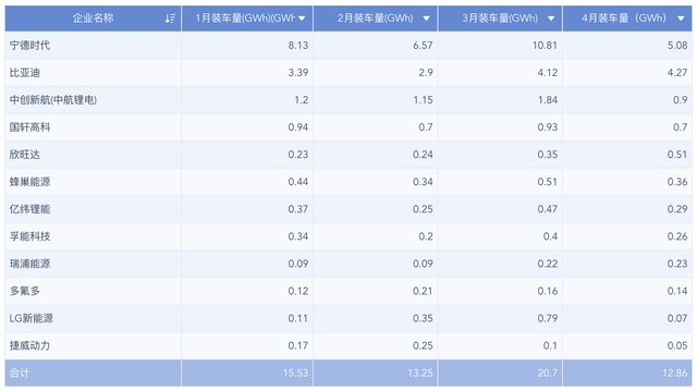 ▲表1. 1-4月主要動力電池的企業(yè)