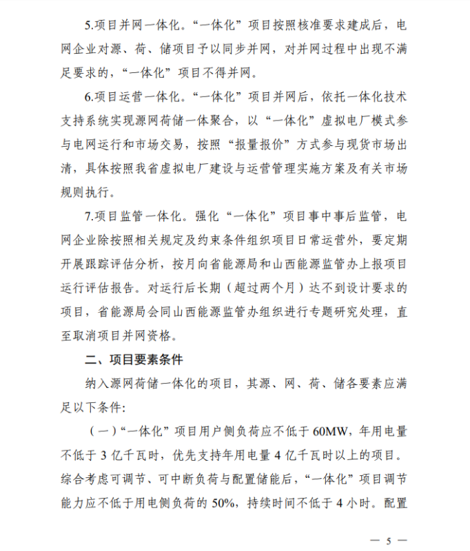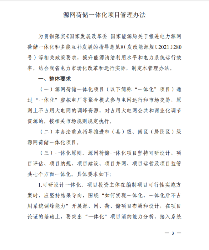 中國(guó)儲(chǔ)能網(wǎng)訊:為貫徹落實(shí)《國(guó)家發(fā)展改革委 國(guó)家能源局關(guān)于推進(jìn)電力源網(wǎng) 荷儲(chǔ)一體化和多能互補(bǔ)發(fā)展的指導(dǎo)意見(jiàn)》(發(fā)改能源規(guī)〔2021〕280 號(hào))等相關(guān)政策要求,提升能源清潔利用水平和電力系統(tǒng)運(yùn)行效 率,結(jié)合我省電力市場(chǎng)化改革和運(yùn)行實(shí)際,制定源網(wǎng)荷儲(chǔ)一體化項(xiàng)目管理辦法。