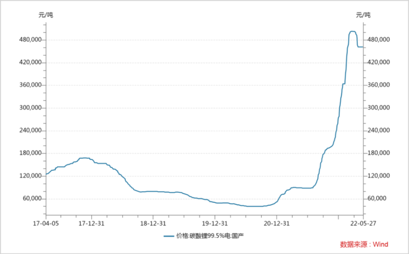 2021年,碳酸鋰漲價(jià)幅度高達(dá)430%以上。進(jìn)入2022年,局面進(jìn)一步失控,碳酸鋰價(jià)格從年初的28萬(wàn)/噸最高漲至超50萬(wàn)/元噸,在短短三個(gè)月的時(shí)間里又翻了近乎一倍。