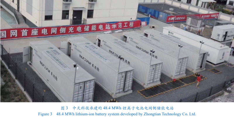 鋰離子電池在電力系統(tǒng)中另一大應(yīng)用在電網(wǎng)側(cè)。在變電站配套儲能系統(tǒng)、通過電網(wǎng)的智能調(diào)度來實(shí)現(xiàn)削峰填谷,延緩電網(wǎng)的投資及提高電網(wǎng)主動調(diào)節(jié)能力。2016年,美國加利福尼亞州緊急開展 100 MW的鋰離子電池儲能實(shí)施計(jì)劃,以應(yīng)對電力短缺問題。該電池系統(tǒng)主要用于在白天儲存加利福尼亞州光伏電站資源發(fā)出的電力;在太陽落山后,儲能系統(tǒng)被調(diào)度將電力釋放給電網(wǎng)。2017年 1月,美國特斯拉公司為南加利福尼亞州愛迪生公司的 Mira Roma變電站建成了輸出功率 20 MW、總?cè)萘?80 MWh的鋰離子儲能系統(tǒng),該系統(tǒng)成為當(dāng)時全球最大的電池儲能系統(tǒng)。隨后在 2017年 2月,AES公司采用三星公司的鋰離子電池為圣迭戈煤氣電力公司(SDG&E)在加利福尼亞州 Escondido市部署了輸出功率 30 MW、總?cè)萘?120 MWh的儲能系統(tǒng)。該項(xiàng)目 30 MW鋰離子儲能系統(tǒng)全部在 6個月內(nèi)并網(wǎng)投運(yùn),這不僅推動儲能成了未來應(yīng)對電網(wǎng)危機(jī)的重要解決方案,也為利用分布式儲能滿足當(dāng)?shù)仉娏θ萘啃枨筇峁┝藦?qiáng)有力的支撐。2021年 7月,英荷殼牌石油公司宣布 100 MW儲能電站全面投入運(yùn)營,這是歐洲目前最大規(guī)模的儲能電站;其位于英國西南部威爾特郡附近,由 2個裝機(jī)容量均為 50 MW/50 MWh的電池儲能設(shè)施構(gòu)成,采用磷酸鐵鋰/三元鋰電池技術(shù)。2018年,為解決國電諫壁發(fā)電廠 3臺 330 MW發(fā)電機(jī)組退役后帶來的電力缺口問題,中國國家電網(wǎng)江蘇省電力有限公司利用丹陽、揚(yáng)中、鎮(zhèn)江等地 8處退役變電站場地,緊急建設(shè)鎮(zhèn)江儲能電站工程,充分發(fā)揮儲能設(shè)備建設(shè)周期短、配置靈活、響應(yīng)速度快等優(yōu)勢,有效緩解了供電壓力。該電網(wǎng)側(cè)儲能項(xiàng)目采用“分散式布置集中式控制”方式,建設(shè)了 8個儲能電站項(xiàng)目,全部采用磷酸鐵鋰電池技術(shù),規(guī)模共計(jì) 101 MW/202 MWh。該儲能電站于 2018年 7月 18日正式并網(wǎng)投運(yùn)。2020年度,江蘇中天科技股份有限公司承建的全球最大的電網(wǎng)側(cè)儲能電站江蘇二期昆山 48.4 MWh儲能電站投入運(yùn)營(圖 3);該公司承建的國家“863計(jì)劃”重點(diǎn)研發(fā)項(xiàng)目——動力電池規(guī)?;荽卫霉こ虄δ茈娬緞t是全國最大的用戶側(cè)梯次利用儲能電站項(xiàng)目,亦于2020年末投入試運(yùn)行。