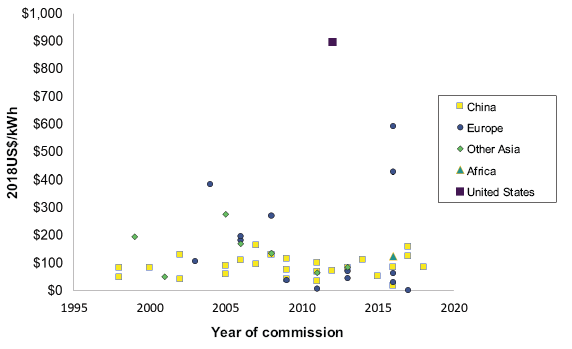 圖3.2和3.3顯示了抽水蓄能設(shè)施在裝機(jī)容量(kW)和儲(chǔ)能容量(kWh)的建設(shè)成本。1995年以來(lái),世界主要國(guó)家和地區(qū)總體部署趨勢(shì)平穩(wěn)。而不同項(xiàng)目和不同國(guó)家的成本差異很大。