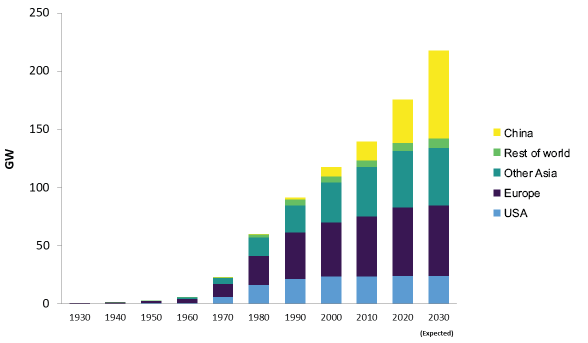 圖3.1世界各地的抽水蓄能設施裝機容量的增長增況