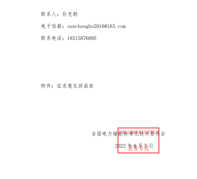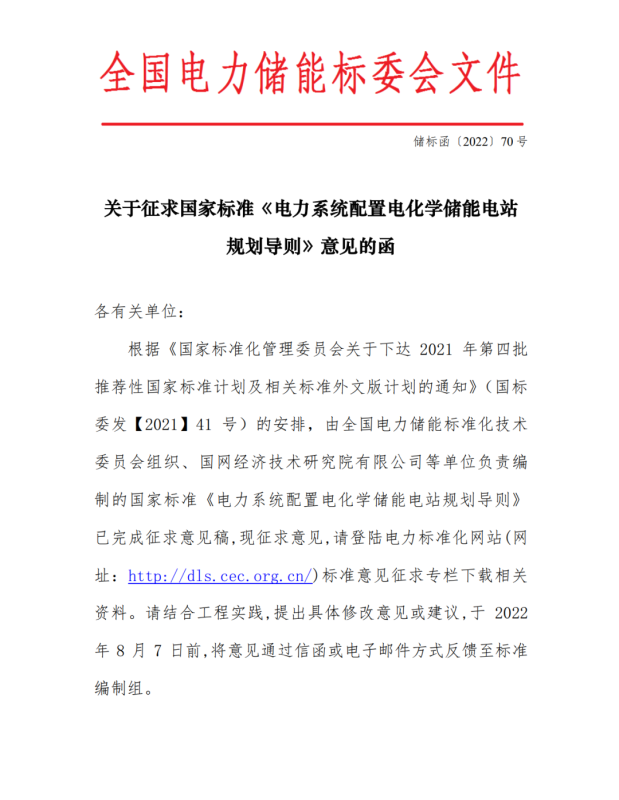 關于征求國家標準《電力系統(tǒng)配置電化學儲能電站規(guī)劃導則》意見的函