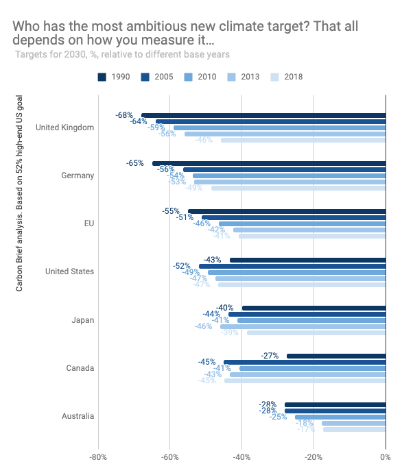 如果以1990年為基準(zhǔn)年,各國2030年氣候目標(biāo)按“雄心”的程度排序是: