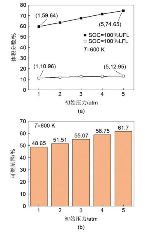 提取轉折點處的體積分數(shù),得到初始壓力變化時的可燃極限。如圖11所示,LFL及UFL均隨初始壓力的增加而增大,且UFL變化較為明顯。當初始壓力從1 atm增加到5 atm時,LFL增加了約2%,UFL增加了約15%。這意味著初始壓力的增加會使?jié)饣旌蠚獾姆磻燥@著增加,而稀混合氣的反應性略有下降。說明壓力增加時,會加快濃燃混合氣分子之間的碰撞,因此UFL會增大;而混合氣在較稀的濃度燃燒時,壓力的提升反而抑制了其燃燒過程。雖然初始壓力的升高會使LFL略有增加,原本較稀的燃料可能在較高的壓力下變得不可燃,但從數(shù)值上來看,可燃上限的增加明顯高于可燃下限,從而可燃范圍被擴大,這間接表明當初始壓力升高時火災爆炸的潛在危險性更大。