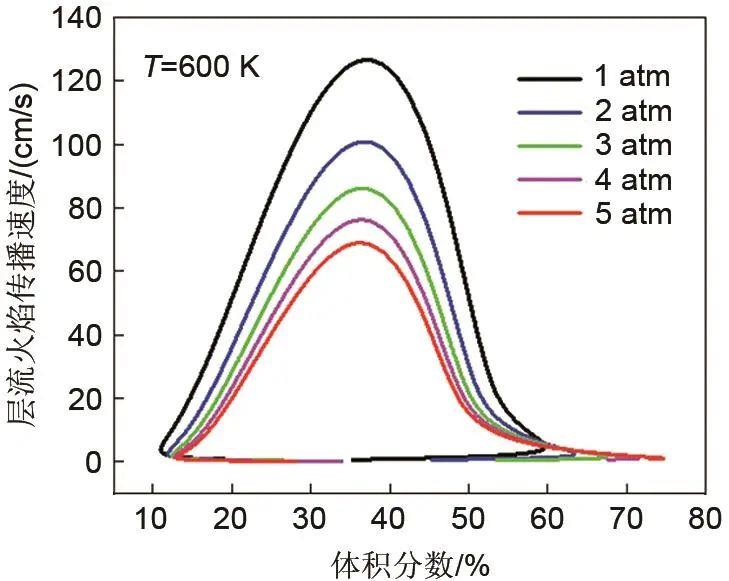 當電池發(fā)生熱失控時,產生的氣體在電池包內聚集,類似于氣體集中在密閉空間內造成氣體壓力的升高,如圖5實驗結果所描述的那樣。而壓力的升高會導致燃燒特性的變化,接下來以SOC=100%的電池為例,探究初始壓力對熱釋放氣燃燒特性影響。圖10為電池熱失控排氣在不同初始壓力時體積分數(shù)與層流火焰?zhèn)鞑ニ俣汝P系。發(fā)現(xiàn)火焰?zhèn)鞑ニ俣入S初始壓力升高而降低,火焰速度的峰值保持在燃料體積分數(shù)為36%左右,此時燃料的當量比約為1.1。另外發(fā)現(xiàn)隨著初始壓力的升高,稀燃和濃燃處的轉折點均向體積分數(shù)增大的方向移動,表明可燃下限及可燃上限均呈現(xiàn)增加的趨勢。