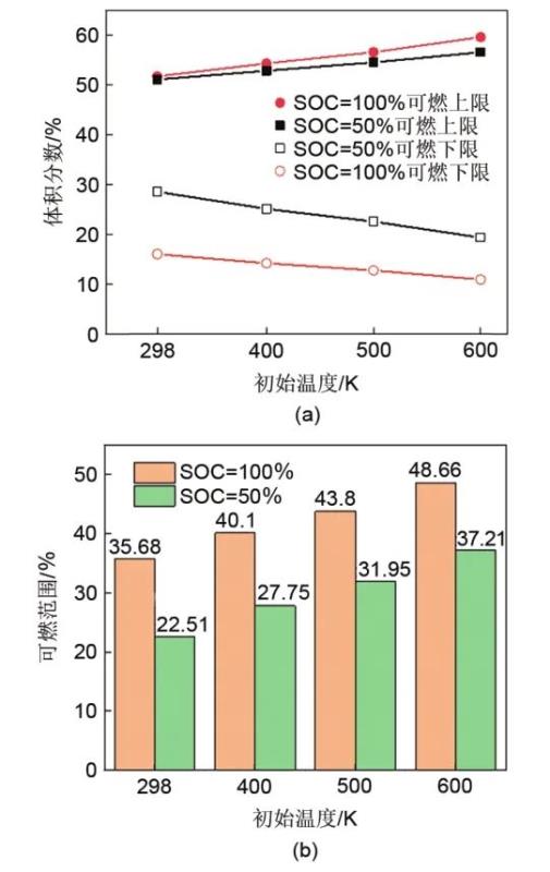 提取轉折點處的體積分數(shù),得到電池熱失控排氣在不同初始溫度時可燃極限。如圖9(a)所示,排氣的可燃極限值與初始溫度之間存在一定的線性關系。LFL基本隨初始溫度的增加線性降低,UFL隨初始溫度的增加線性升高。這一現(xiàn)象與Wierzba等通過定容燃燒彈實驗測定不同溫度下CO/H2/CH4合成氣的可燃極限變化規(guī)律較為一致。從數(shù)值上看,當SOC=50%,初始溫度由298 K增加到600 K時,LFL降低了約9%,當SOC=100%時,LFL降低了約5%。這意味著原本不可燃燒的稀薄燃料,在初始溫度升高后可能會變得可燃。定義可燃范圍為UFL的體積分數(shù)與LFL體積分數(shù)之差,如圖9(b)所示,排氣的可燃范圍隨初始溫度增加而擴大。當初始溫度由298 K增加到600 K時,可燃范圍增加了約15%。
