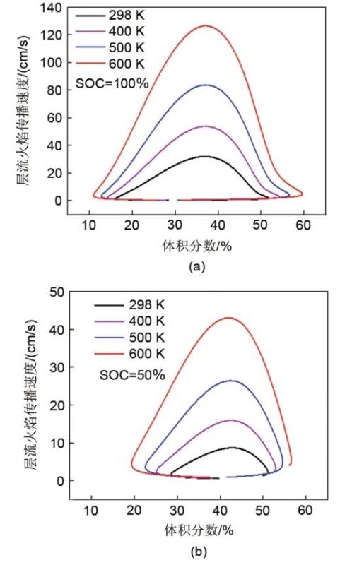 混合氣體的可燃極限不僅與氣體組成有關,還與氣體初始條件有直接關系。同時,電池在排出氣體的時候,往往處于高溫狀態(tài)。如表1所示,熱失控排氣過程中電池的最高溫度達到了600 K左右。仿真計算了電池排氣在不同初始溫度時的可燃極限,圖8為電池熱失控排氣在不同初始溫度時層流火焰?zhèn)鞑ニ俣入S體積分數(shù)的變化曲線。如圖所示,隨著初始溫度逐漸增加,兩種SOC電池排氣的火焰?zhèn)鞑ニ俣染黾印OC為100%時,當初始溫度由298 K增加到600 K,火焰?zhèn)鞑ニ俣确逯涤?0 cm/s顯著提高到130 cm/s。另外,隨著溫度的增加,稀燃及濃燃處的火焰?zhèn)鞑ニ俣惹€的拐點分別向更稀及更濃的區(qū)域移動,說明LFL降低而UFL增加。因為隨著初始溫度的增加,混合氣的總能量隨著附加焓的增加而增加,反應速度加快,反應時間縮短,從而使混合氣在濃度較高及濃度較低的條件下都變得更易燃,可燃范圍相應擴大。