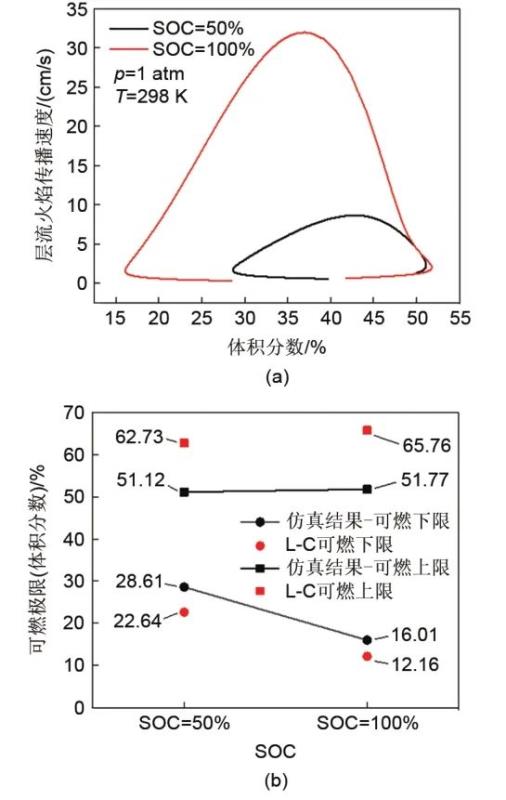 使用搭建的仿真模擬平臺,通過逐漸增大和減小氣體的濃度,計算釋放氣在不同濃度時的層流火焰?zhèn)鞑ニ俣?,對排氣的可燃極限進行仿真計算,在這里氣體濃度以體積分數(shù)的形式表示。圖7(a)為常溫常壓時排氣體積分數(shù)與層流火焰?zhèn)鞑ニ俣戎g的變化曲線,圖7(b)為排氣可燃極限值的仿真結果與L-C公式計算結果的對比。圖7(a)表明,在氣體濃度相同時,電量較高的電池釋放氣具有更大的層流火焰?zhèn)鞑ニ俣?,且在濃度較稀時依然可以穩(wěn)定傳播。分析圖7(b)可得,兩種不同SOC的電池排氣可燃上限相差不大,SOC=100%的電池排氣具有更低的可燃下限。這意味著與50%SOC的排氣相比,其可以在更低的濃度穩(wěn)定燃燒,危險性更大。分析電池排氣的組分可知,SOC=100%時,排氣的可燃組分含量較SOC=50%時更高,而惰性氣體含量更少,因此更加易燃。