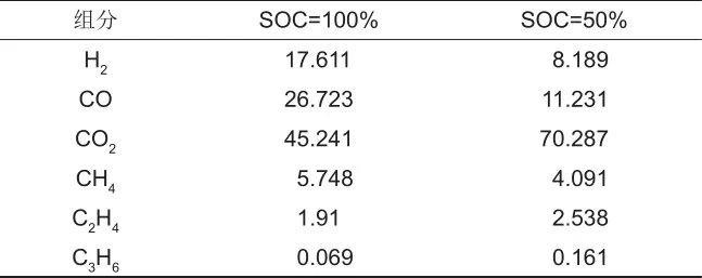 通過分析熱釋放氣體組分比例,選取了含量中占絕大多數(shù)的CO、H2、CO2、CH4、C2H4和C3H6作為仿真計算的氣體組分。其中100%SOC的熱釋放氣占總體組分的97.3%,50%SOC的熱釋放氣占總體組分的96.5%。詳細的比例見表2。