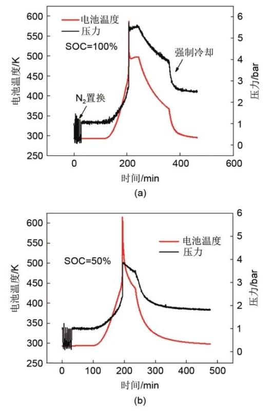 分析表1,當電池電量較高時,加熱開始至熱失控時間較短,表明其更容易發(fā)生熱失控。熱失控發(fā)生時電池最高溫度相差不大,100%SOC的電池最高溫度為586.84 K(313.84 ℃),比50%SOC的電池低約30 K。在排氣階段,滿電的電池產氣量更多,50%SOC的電池產氣量為2.37 L,100%SOC電池產氣量達到了4.28 L。另外高SOC的電池瞬時最大產氣量更大,特別是產氣速率更快,約為50%SOC電池的6倍。說明電量高的電池更容易被觸發(fā)熱失控,熱失控產氣噴發(fā)得更猛烈,噴發(fā)量也更多,危險性也相應較大。