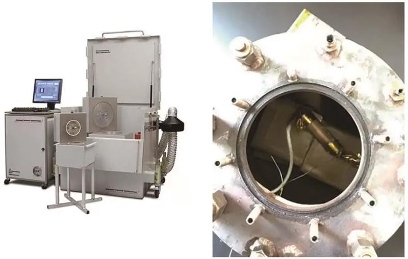觸發(fā)電池熱失控以及收集氣體使用自行改造的加速量熱儀(accelerating rate calorimeter,ARC),設備如圖2所示。生產廠家為英國THT公司,精度可達0.02 ℃/min。ARC可以提供一個(近似)絕熱的環(huán)境,并通過“加熱(heat)-等待(wait)-搜尋(seek)”模式對電池進行臺階加熱,模擬電池與環(huán)境無熱交換狀態(tài)下,電池的熱失控過程。通過在ARC的量熱腔中增加1個內徑Φ164 mm、深度164 mm的金屬密封罐(容積為3.46 L)可以收集熱失控過程噴發(fā)的氣體并實現(xiàn)熱失控過程中外部氣壓的測量,得到氣壓-時間(p-t)曲線,進而計算得到電池熱失控過程中的產氣量。