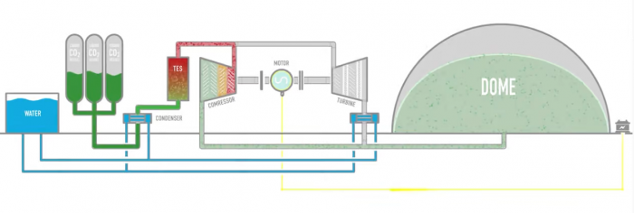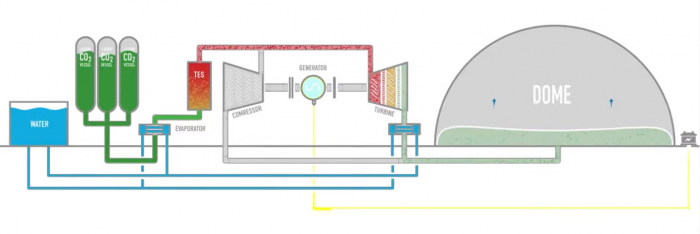 Energy Dome的電池使用巨大的穹頂,其中有巨大的、靈活的囊袋,里面充滿了二氧化碳?xì)怏w。它通過使用能量來運(yùn)行電動(dòng)壓縮機(jī),將氣體擠壓成越來越小的體積,最終將其冷凝成液體,在環(huán)境溫度下儲(chǔ)存,從而為電池“充電”。這個(gè)充電過程產(chǎn)生廢熱,并被收集到熱能儲(chǔ)存系統(tǒng)中。