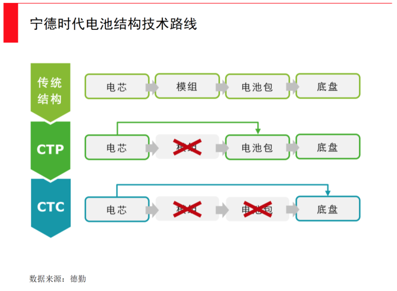 寧德時(shí)代的CTP電池,與比亞迪刀片電池類似,不同點(diǎn)在于其仍保留了部分模組,但是通過減少模組的使用,增加電芯數(shù)量或體積,提升集成效率。