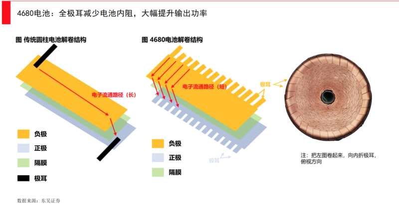 傳統(tǒng)電池只有兩個(gè)極耳,分別連接正極與負(fù)極,而4680電池實(shí)現(xiàn)了全極耳,直接從正極/負(fù)極上剪出極耳,大大縮短了極耳間距,進(jìn)而大幅提升了電池功率(6倍于2170電池)。而且電子更容易在電池內(nèi)部移動(dòng),電流倍率提高,因此充放電速度更快。