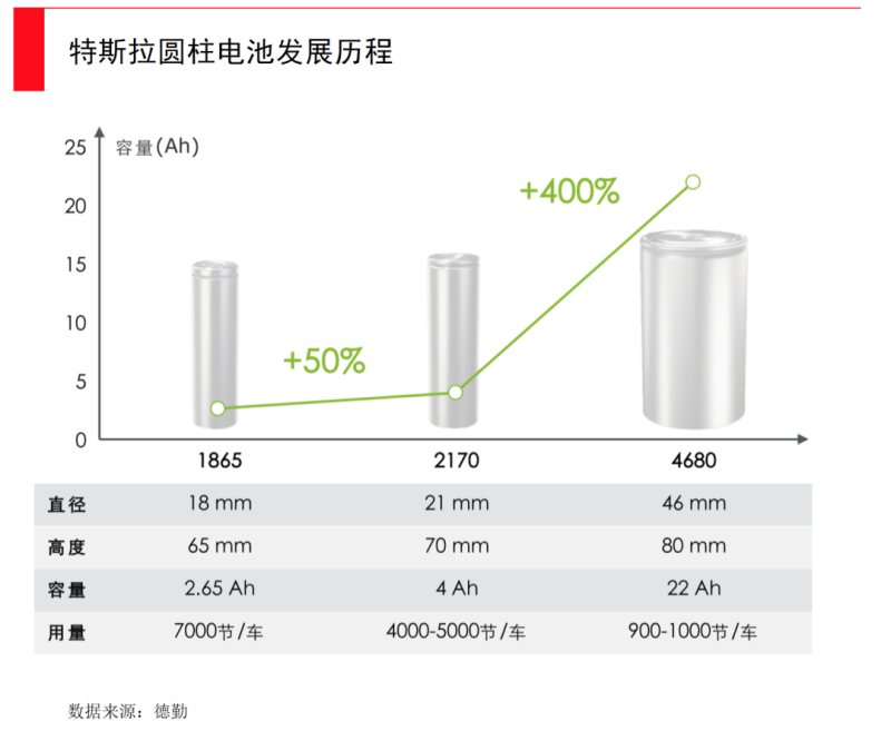 4680的亮點(diǎn)是,相比于上一代2170,能量提升了5倍、續(xù)航里程提升16%、功率提升6倍、在電池組層面每千瓦時(shí)成本降低14%。