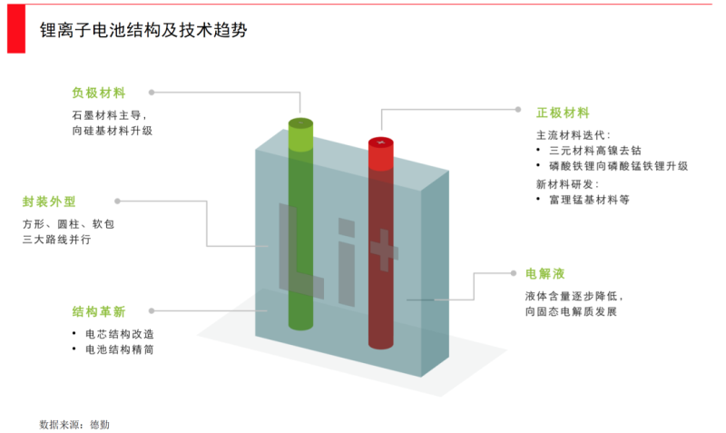 在材料升級(jí)上,正極已形成磷酸鐵鋰和三元材料并行的局面,離理論極限還有空間,這個(gè)局面中短期不會(huì)改變;負(fù)極處于突破期,正在從石墨向硅基演進(jìn)。