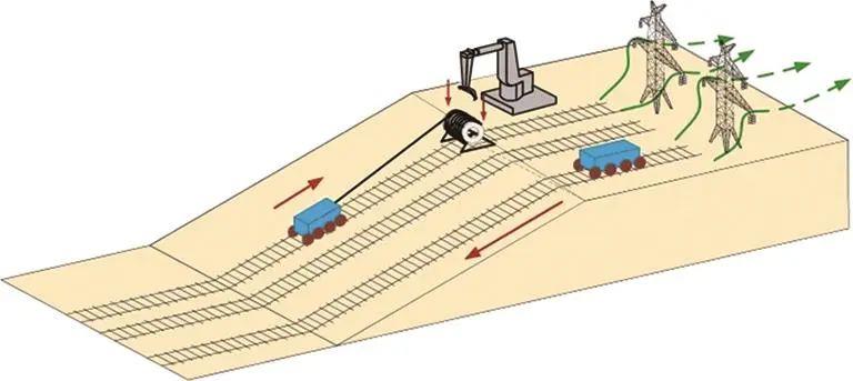 美國ARES公司(Advanced Rail Energy Storage)2014年提出一種機(jī)車斜坡軌道系統(tǒng),機(jī)車在軌道上上坡下坡進(jìn)行儲(chǔ)能和釋能(圖8),2020年在內(nèi)華達(dá)州開始施工建設(shè)。該技術(shù)已在加州特哈查皮的一個(gè)試點(diǎn)項(xiàng)目中測(cè)試成功,其首個(gè)商業(yè)部署正在內(nèi)華達(dá)州帕倫普市開發(fā),并將與加州電網(wǎng)連接。這個(gè)儲(chǔ)存系統(tǒng)將使用一個(gè)由210輛貨車組成的車隊(duì),總重7.5萬噸,在10條長(zhǎng)度9.3 km、平均坡度7%的軌道上,電動(dòng)機(jī)帶動(dòng)鏈條將這些貨車拖到山頂。當(dāng)需要電力時(shí),車輛被送回山下,當(dāng)它們下落時(shí),鏈條帶動(dòng)發(fā)電機(jī)發(fā)電。ARES宣稱,這座儲(chǔ)能系統(tǒng)可以提供持續(xù)15 min 50 MW的電力,效率可達(dá)75%~86%。這種儲(chǔ)能系統(tǒng)利用了山地地形和軌道車輛,可以實(shí)現(xiàn)室外環(huán)境下大容量?jī)?chǔ)能,但平整山坡的土建成本較高,鏈條傳動(dòng)平穩(wěn)性差易磨損,還需要進(jìn)一步的結(jié)構(gòu)優(yōu)化。